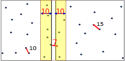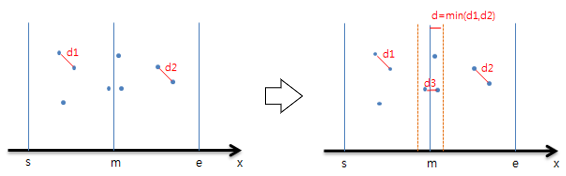 ③ merge될 때, 좌측, 우측 부분에서 각각 가장 가까운 두 점 사이의 거리를 구합니다.