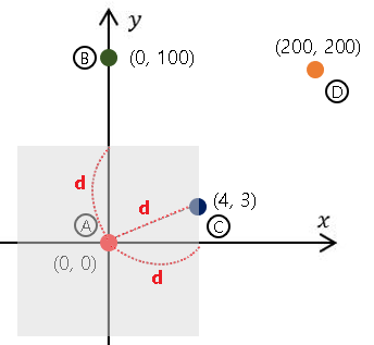 ex) 두 점 사이의 거리 = d = 5일 때, 코드상에서는 제곱처리하여 d * d하여 비교합니다.