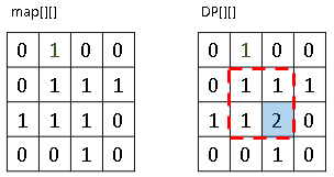 DP[i][j]는 map[i][j] = 1인 지점에서 점화식
