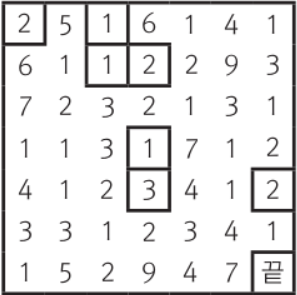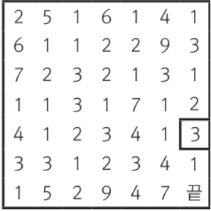 - 맨 왼쪽 윗 칸에서 출발하여 오른쪽 아래 칸으로 이동하여 『끝』 지점까지 이동