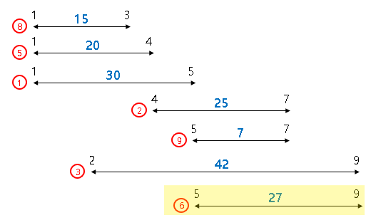 DP[7]은 여섯번째 요청 [5, 9]로 해당 기간과 겹치지 않으면서 가장 마지막 요청은