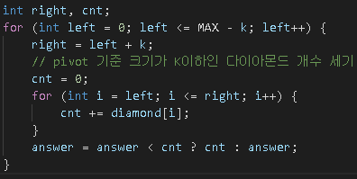 "선택된 다이아몬드 크기 차이가 K 이하인 것들"을 처리할 때는
