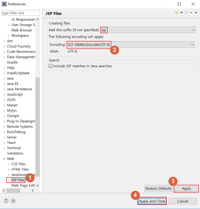 이렇게 설정하면 주로 Java 파일들에 대한 기본 인코딩이 UTF-8 로 설정됩니다.