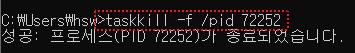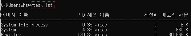 ② "tasklist" 입력하면 아래와 같이 Process 이름과 pid 목록이 나옵니다.