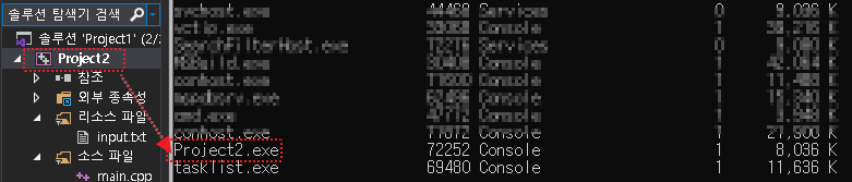 프로세스 중 Visual Studio에서 실행한 프로젝트 이름과 동일한 "프로젝트 이름.exe"가 있습니다.