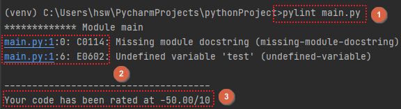 해당 코드에 pylint를 적용해보고자 터미널에서 해당 파일 경로에서 아래 명령어 입력