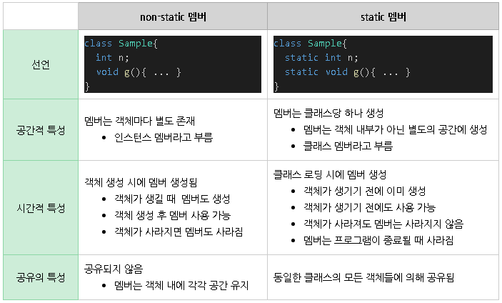 - static을 맴버(변수,메소드) 앞에 붙이면 클래스의 맴버가 된다.