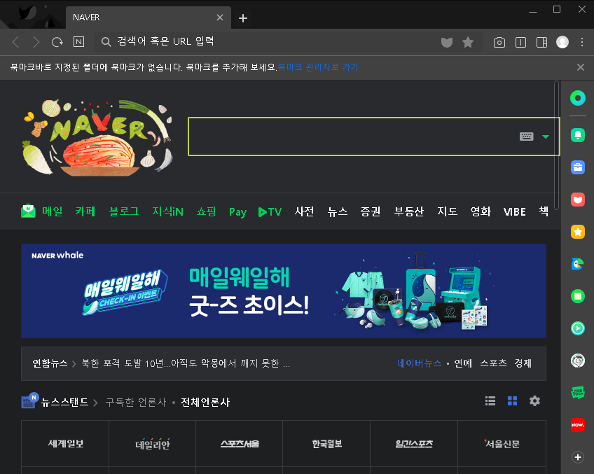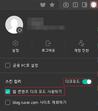 웨일 브라우저에서 다크 모드는 콘텐츠 페이지 부분뿐만 아니라 창 전체를 변경해줍니다.