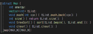 - map[][] 안에 양분energy과 나무 목록 tList를 가집니다.