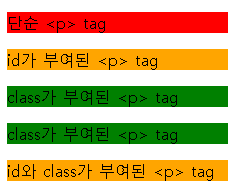 <p id="bg-orange" class="bg-green bg-blue">id와 class가 부여된 <p> tag</p>