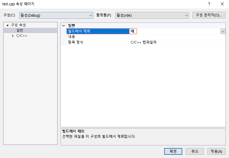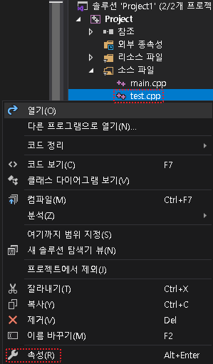 ① [xxx.cpp] 소스 우클릭 - [속성]