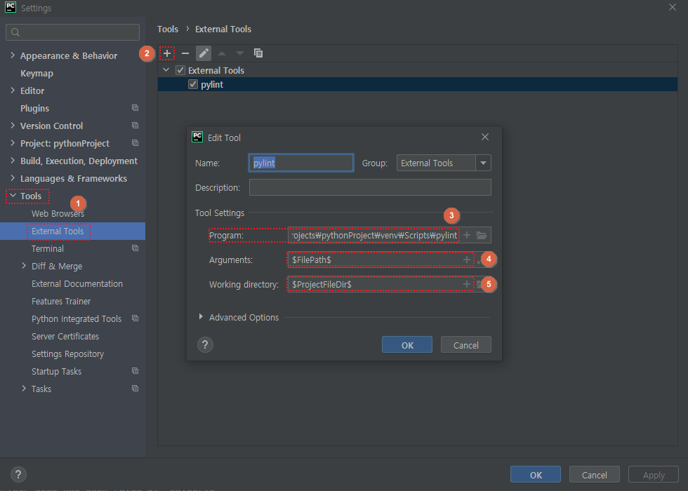 ④ "+"에서 "$FilePath$" 관련 항목 선택