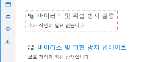 알약, V3 등 백신프로그램이 설치없이 Windows Defender를 사용하고 있는 상태일 것입니다.