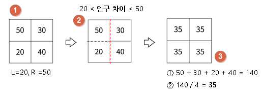 ③ 인접한 지점에서 연결통로를 통해서만 인구 이동이 이루어진다. (* 소수점은 버린다.)