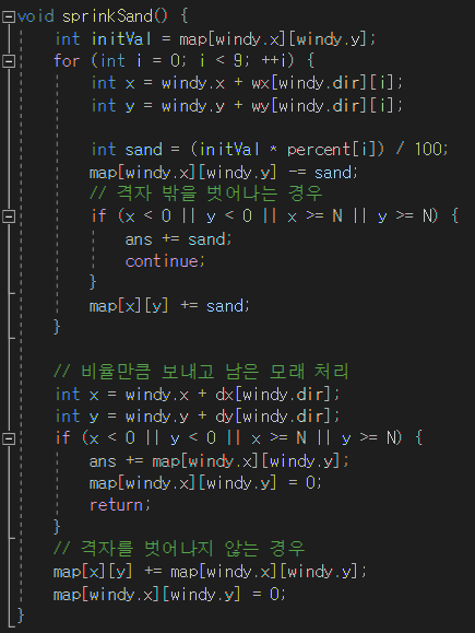② 이동된 토네이도 위치와 방향에 따른 모래 처리