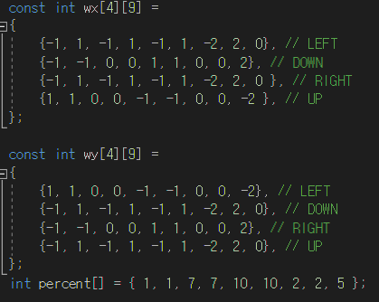 int percent[] = { 1, 1, 7, 7, 10, 10, 2, 2, 5 };