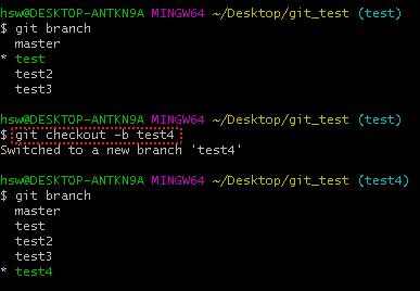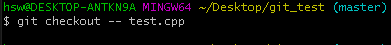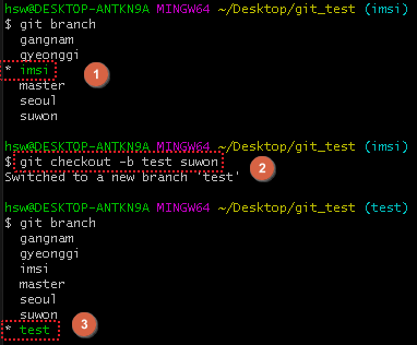 ② "suwon" 이라는 브랜치에 파생 브랜치로 "test" 라는 브랜치를 생성하고, checkout 한다.