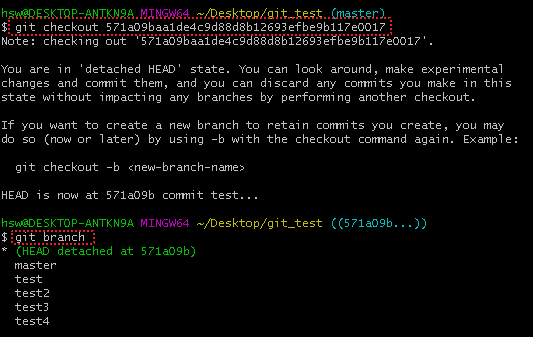 해당 Commit 시점으로 이동되며, 임시 Branch에 속해져 있는 것을 확인할 수 있다.