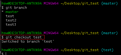 ③ 다시 상태를 확인했을 때, "test"로 위치 되어 있는 것을 확인할 수 있다.