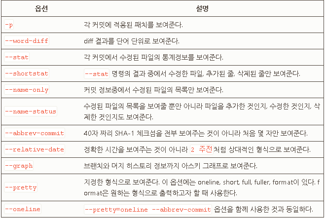- 각 Commit의 SHA-1 체크섬, 저자 이름, 저자 이메일, 커밋한 날짜, 커밋 메시지를 보여준다.