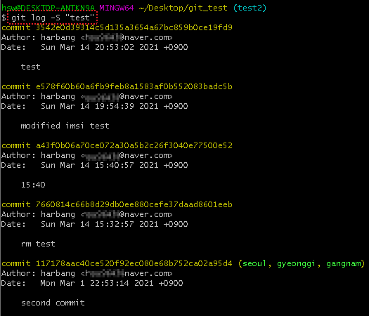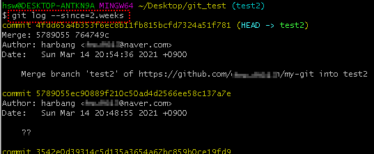 git log에서는 기간, 저자, 커미터, 특정 텍스트 포함 여부 등을 조정할 수 있다.