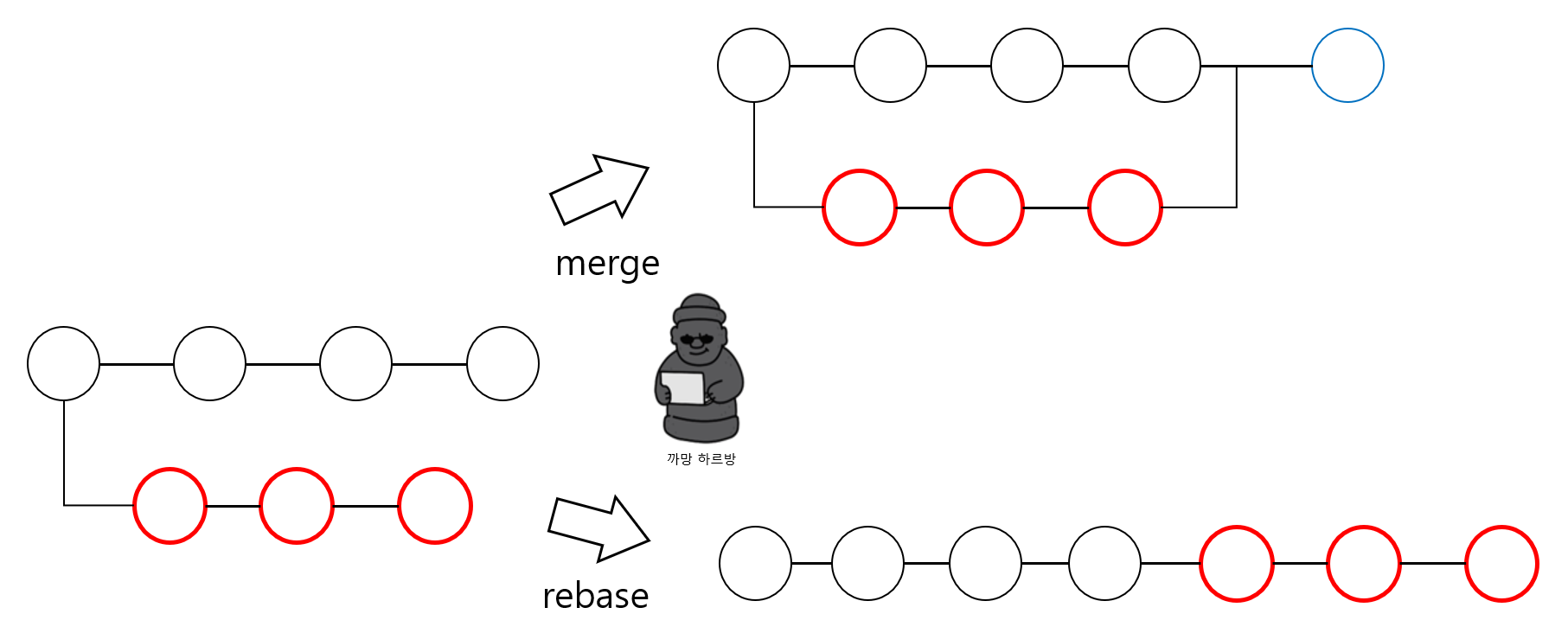 • merge 두 브랜치의 최종 결과만을 가지고 합친다
