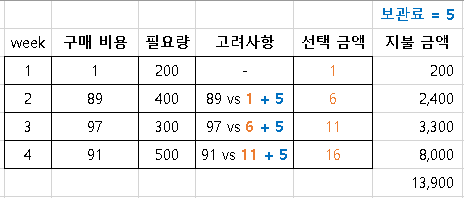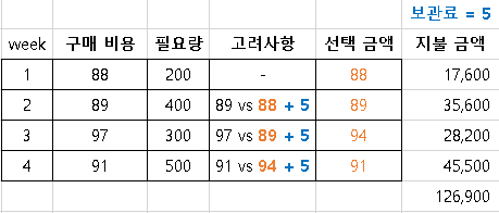 ▶ 해당 주차에 구매금액 vs (지난주에 선택한 금액 + 보관 비용)을 비교해서 저렴한 금액을 선택해야 합니다.