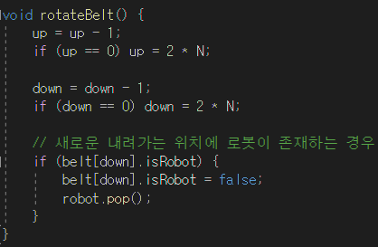 - 컨베이어 벨트 belt[]의 순서를 바꾸지 않고, up/down 변수로 회전 구현