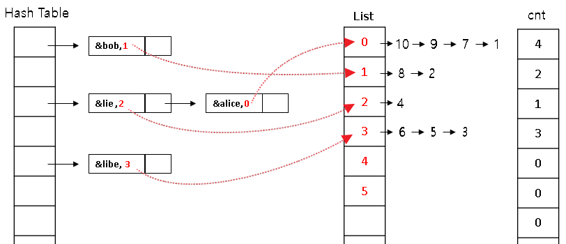 // 문자열이 중복된 개수 (head[i]가 가르키는 리스트 크기)