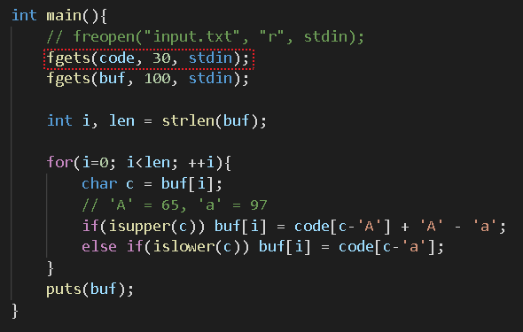 if(isupper(c)) buf[i] = code[c-'A'] + 'A' - 'a';