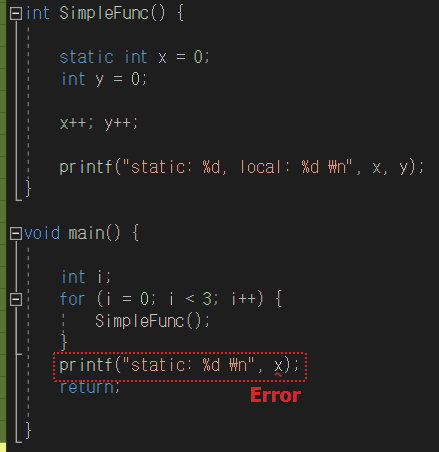 - 전역변수와 지역변수 모두에 static 선언을 추가할 수 있다.