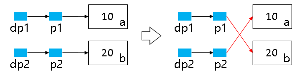 즉, dp1의 실제값(p1), dp2의 실제값(p2)가 교환되어 p1,p2가 가리키고 있는 값이 달라집니다.