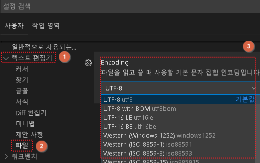 만약 여러파일 깨져서 VS Code에서 파일마다 Reopen 하기 번거로울 때는 자동 설정도 가능하다.