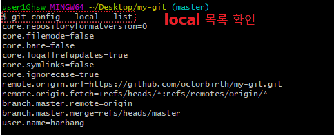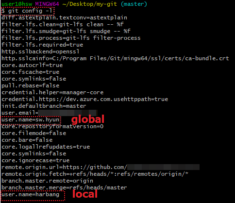 $ git config --list 명령으로 항목이 여러개 보일 수 있다.