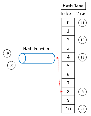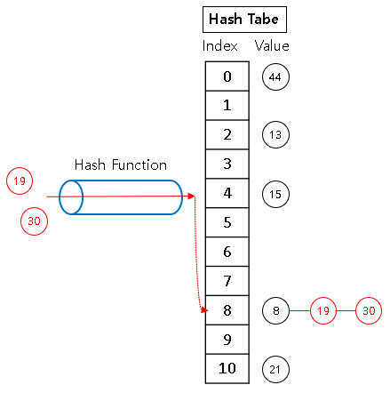 아래와 같은 상황에서 원소 {19, 30}을 저장할 때,