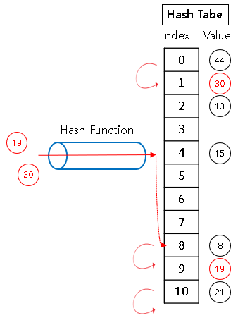 ② "30"를 넣었을 때, Hash Table[8]에 "8" 이 있기 때문에 다음 빈 자리 탐색