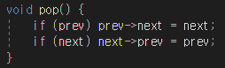 pop 함수를 보면, 이전/다음 Node가 존재하는 경우에 포인터 연결 처리해준다.