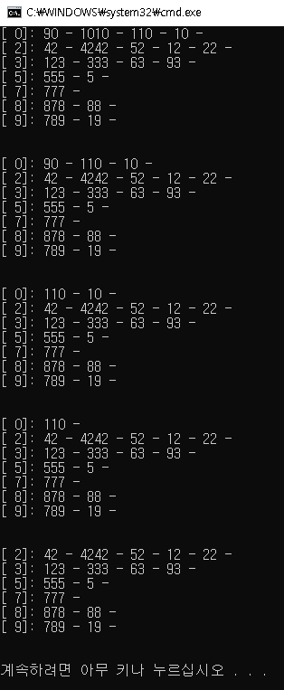 remove(110); print(); // head[0] 연결리스트가 비워지는 경우