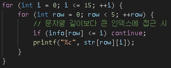 이때, 배열 인덱스 접근 시 overflow 방지를 위해서 문자열의 길이보다 큰 위치에 인덱스 접근에 유의합니다.