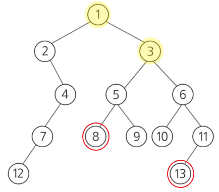 노드 [8]의 부모노드는 [5]이며, [13]의 부모노드는 [11]이다.