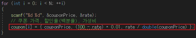 coupon[i] = { couponPrice, (100 - rate) * 0.01, rate / double(couponPrice) };