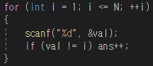 i 번째 인덱스의 배열 값을 입력받을 때, 입력값이 i와 동일하지 않으면 ans 변수가 올라간다.