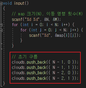 이동이 끝나고는 해당 위치에 물을 증가시키고, 구름 위치(visited[][])를 표시한다.