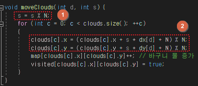 moveClouds(d, s); // d 방향으로 s 만큼 구름 이동