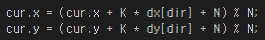 int nextY = (cur.y + (dy[dir] * K) + N) % N