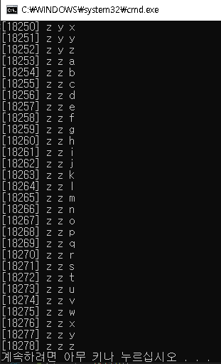 "a" ~ "zzz" 까지 구성되는데, 아스키 코드 + 중복을 허용하는 순열로 구할 수 있다.
