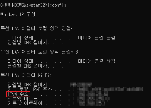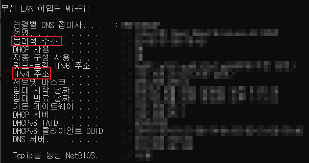 ② 논리(가상) 주소는 명령 프롬프트 창에서 아래 명령어로 확인할 수 있다.