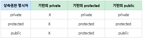- 기반 클래스의 protected와 public 권한의 멤버는