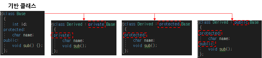 ; 기반클래스로부터 상속받는 멤버들의 파생클래스에서의 접근권한 결정