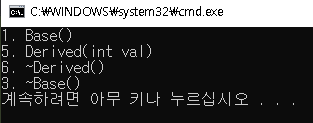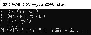 5. Derived(int val)는 예상대로 호출되었지만 1. Base()가 호출되었다.